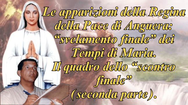 Negli ultimi anni, soprattutto sotto l’ultimo Pontificato, i messaggi della Regina della Pace di Anguera presentano una struttura molto comune e, a parte alcune profezie occasionali inserite come inframmezzo nel corpo dei messaggi e l’invito a seguire alcuni particolari esempi biblici di fedeltà a Dio e franchezza profetica tratti sia dal Vecchio che dal Nuovo Testamento, la Madonna insiste su determinati punti che vale la pena sottolineare. Rimangono tutti i grandi temi spirituali dei messaggi dati durante gli anni precedenti ma vi sono delle sottolineature nuove (per es. circa l’Eucaristia) o vere e proprie “nuove rivelazioni”. Prenderò in esame, per comodità, solo i messaggi del 2017 in cui le tematiche a cui faccio riferimento sembra che si consolidino definitivamente. Continua...